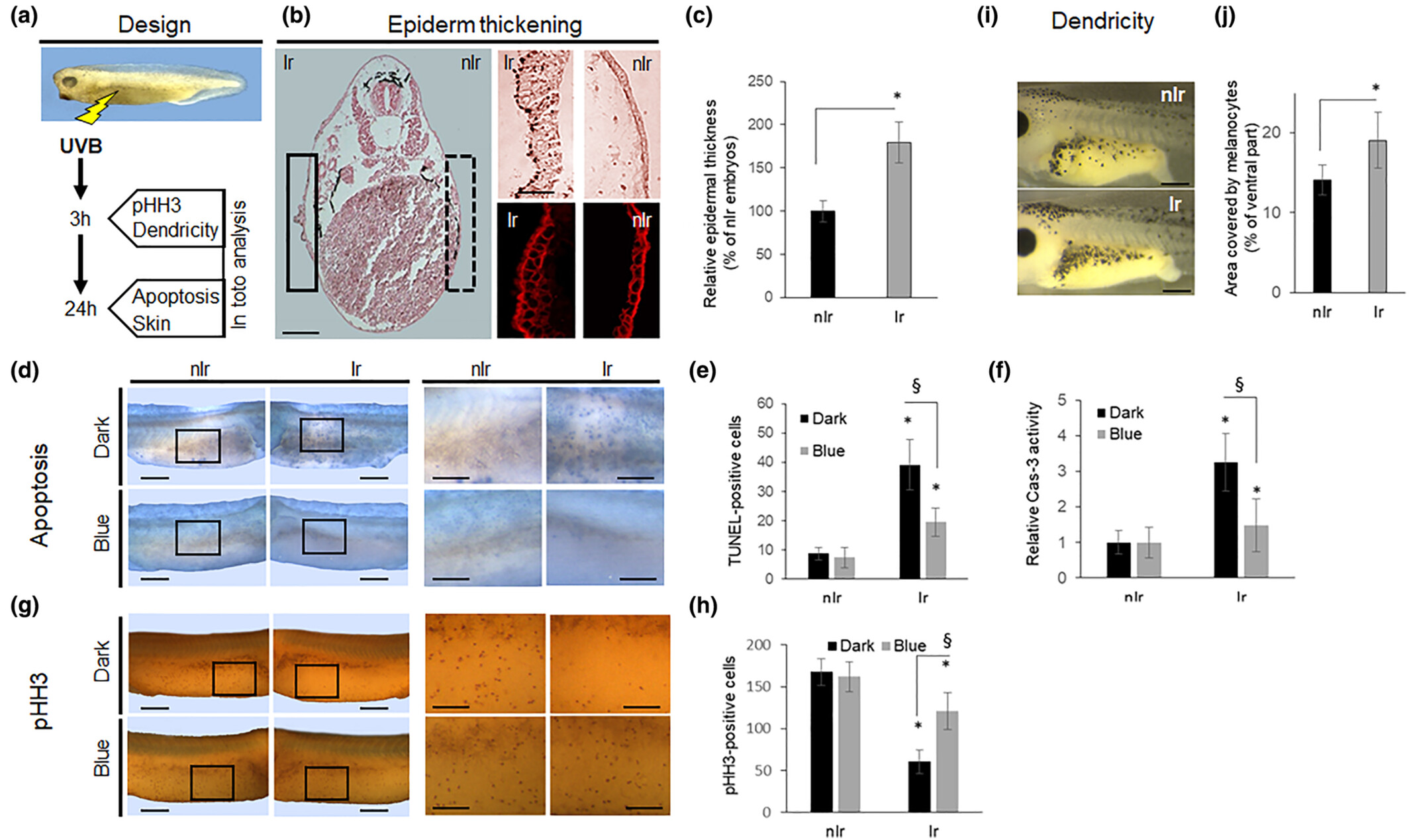 FIGURE 3. Skin homeostasis following exposure of Xenopus embryos to UVB irradiation. (a) Experimental design. Embryos were UVB irradiated and in toto analyzed 3 hr postirradiation for pHH3 and dendricity and 24 hr postirradiation for apoptosis and skin histological analysis. (b) Histological section of a stage 42 embryo stained by hematoxylin–eosin (Left panel) showing epidermal thickness of the irradiated (Ir) side compared with non-irradiated (nIr) side. Scale bar is 250 μm. Upper right panel, enlargement of the framed regions displayed on the left (solid line for nIr side and dotted line for Ir side). Lower right panel, immunostaining of the framed regions with anti-keratin 2 antibody. Scale bar is 20 μm. (c) Quantification of epidermal thickness. Values represent the mean ± SD of epidermal thickness measured in nine randomly selected fields of view per embryos (n = 6). (d) Detection of apoptosis by TUNEL assay of irradiated embryos that has been kept in the dark (Dark) or under blue light (Blue) after irradiation. The irradiated (Ir) versus non-irradiated (nIr) sides of embryos are shown (Scale bar is 1 mm). An enlarged region is shown on the right (Scale bar is 200 μm). (e) Quantification of TUNEL-positive cells. Cells that showed intense TUNEL staining were scored positive (n = 6). The numbers of TUNEL-positive cells (i.e., apoptotic cells) is remarkably reduced in blue light-exposed embryos (Blue) compared with embryos kept in the dark (Dark). (f) Measurement of caspase-3 activity indicates that apoptotic cell death induction is reduced in blue light-exposed embryos compared with embryos kept in the dark (n = 5 embryos per condition). (g) Proliferation rate analysis by pHH3 assay of irradiated embryos that have been kept in the dark (Dark) or under blue light (Blue) after irradiation. The irradiated (Ir) versus non-irradiated (nIr) sides of embryos are shown (Scale bar is 1 mm). An enlarged region is shown on the right (Scale bar is 200 μm). (H) The number of pHH3-positive cells was reduced in irradiated embryos in the dark compared with blue light-exposed embryos where proliferation rate has been restored (n = 5 embryos per condition). (i–j) Ventral region of a stage 42 embryo showing melanocytes at 9 hr after irradiation (Ir). The proportion of the skin surface covered by melanocytes was significantly increased after irradiation, suggesting an increased number of dendrites (n = 5 embryos per condition). Scale bar is 500 μm. *p < 0.05 for Ir versus nIr embryos. § < 0.05 for embryos exposed to blue light versus embryos kept in dark.
