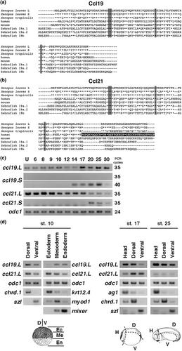 Figure 1. Alignment of Ccl19 and Ccl21 and expression patterns of ccl19 and ccl21. (a and b) Alignment of Xenopus laevis L, Xenopus laevis S, Xenopus tropicalis, human, mouse, and zebrafish Ccl19 (a) and Ccl21 (b). Asterisks (*) indicate conserved amino acids. The conserved cysteine residues are shaded gray. The positively charged 41 amino acids at the C-terminus of human Ccl21 are shaded black. (c and d) Expression patterns of ccl19 and ccl21. odc1 was used as an internal control. (c) Temporal expression patterns. U indicates unfertilized eggs and the numbers indicate developmental stages. (d) Spatial expression patterns. Indicated genes under odc1 were used as positive control markers for each germ layer and tissue. Dissections at several developmental stages were performed as shown in the bottom panels. D, dorsal; Ec, ectoderm; En, endoderm; H, head; Me, mesoderm; V, ventral.