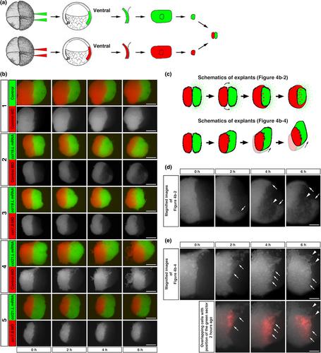 Figure 4. Analysis of haptotactic cell migration. Schematics of the method to make the combined ventral mesodermal explants. ccl19.L mRNA (1000 pg/blastomere) or ccl21.L mRNA (500 pg/blastomere) was co-injected into two ventral blastomeres of four-cell embryos with a green fluorescent tracer. Control-MO (20 ng/blastomere) or ccr7.S-MO (20 ng/blastomere) was co-injected into two ventral blastomeres of four-cell embryos with a red fluorescent tracer. The different fluorescent labeled ventral mesodermal sectors were dissected from stage 10 embryos and their epithelia were removed. Each ventral mesoderm sector was combined for use as combined ventral mesodermal explants. The combined ventral mesodermal explants were placed on a cover glass coated with bovine serum albumin. (b) Observation of the combined ventral mesodermal explants. Reagents injected into each ventral mesodermal sector are indicated on the left. Each combination of ventral mesodermal sectors is numbered. The elapsed time is indicated at the bottom. The two-color versions are indicated in the upper panels. The grayscale versions of red fluorescent labeled ventral mesoderm are indicated in the bottom panels because their contrasts are better than those of the two-color versions. For the number 1, 3, and 5 combinations, the combined ventral mesoderm explants remained in the same locations and the red labeled ventral mesodermal cells did not deeply migrate into the green labeled ventral mesodermal sectors. For the number 2 combination, the red labeled ventral mesodermal cells migrated around the green labeled ventral mesoderm. Several control ventral mesodermal cells invaded into neighboring green labeled ventral mesoderm. For the number 4 combination, the red labeled ventral mesodermal cells deeply invaded into the neighboring green labeled ventral mesodermal sector. Bars, 0.5 mm. (c) Schematics of movement of the combined ventral mesodermal explant. (d) Highly magnified images of the red labeled ventral mesodermal sector of Figure 4b-2 are indicated. Arrows indicate migrating cells around the green labeled ventral mesoderm and arrowheads indicate non-polar shaped cells. Bar, 0.25 mm. (e) Highly magnified images of the red labeled ventral mesodermal sector of Figure 4b-4 are indicated in the upper panels. Overlapping cells with green labeled ventral mesodermal sector 2 h previously were pseudo-colored and are displayed in bottom panels. Arrows indicate monopolar shaped cells, and arrowheads indicate non-polar shaped cells. Bars, 0.25 mm.