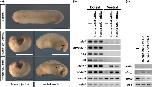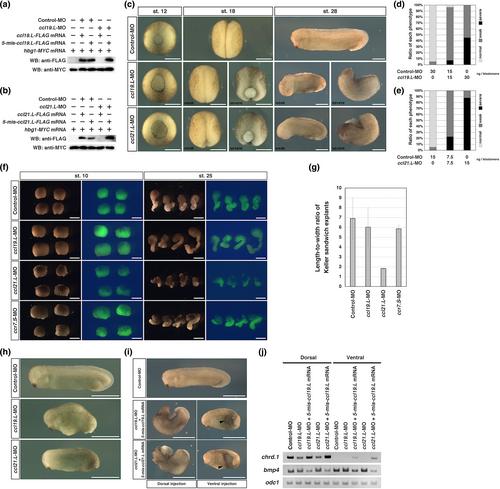 Figure 6. Knockdown effects of Ccl19.L and Ccl21.L on morphogenesis and differentiation. (a and b) Results of western blot analysis. Indicated reagents were injected. hbg1-MYC mRNA was co-injected as the loading control. Specificity of ccl19.L-MO (a) and ccl21.L-MO (b). (c) Phenotypes of embryos after injection with ccl19.L- and ccl21.L-MO into two dorsal blastomeres at the four-cell stage. The developmental stages are indicated in the upper panels. Vegetal view (st. 12), dorsal view (st. 18), lateral view (st. 28). In the stage 18 images of morpholino oligonucleotide (MO)-injected embryos, which were affected in neural fold closure, the left panels show a representative example of the weak phenotypes with delaying neural fold closure and the right panels show a representative example of the severe phenotype of embryos whose neural folds were wide open. In the stage 28 images of MO-injected embryos, which had no head structure, the left panels show a representative example of the weak phenotypes with normal trunk axes and the right panels show a representative example of the severe phenotype with short and bending axes. Bars, 0.5 mm. (d and e) The appearance rates of phenotypes (st. 28) in Figure 6c. Normal phenotype (light gray), weak phenotype (dark gray), and severe phenotype (black) are shown. Injected MO amounts are indicated at the bottom of the graph. (d) ccl19.L-MO-injected embryos. Lane 1: n = 57, normal (94.7%), weak (5.3%), and severe (0%). Lane 2: n = 54; normal (3.7%), weak (88.9%), and severe (7.4%). Lane 3: n = 55; normal (0%), weak (54.5%), and severe (45.5%). (e) ccl21.L-MO-injected embryos. Lane 1: n = 57; normal (94.7%), weak (5.3%), and severe (0%). Lane 2: n = 57; normal (0%), weak (77.2%), and severe (22.8%). Lane 3: n = 58; normal (0%), weak (12.1%), and severe (87.9%). (f) Keller sandwich explants of embryos injected dorsally with ccl19.L-, ccl21.L-, or ccr7.S-MO (30, 15, or 20 ng/blastomere, respectively). Upper panels indicate the stages of time-control embryos. Right images are fluorescence images of the explants. Injection of ccl19.L- and ccr7.S-MO only marginally affected convergent extension cell movements. In contrast, injection of ccl21.L-MO severely inhibited convergent extension cell movements. Bars, 0.5 mm. (g) Length-to-width ratio of Keller sandwich explants (st. 25). The length of the bending parts of the explants was measured along the axial elongation. The longest axis of each explant was divided by its widest perpendicular aspect except for the epidermal ectoderm region. Eight explants were measured in each category. (h) Phenotypes of the ventrally ccl19.L- and ccl21.L-MO-injected embryos (st. 28). All injected embryos had ventral gastrulation defects (n = 45, ccl19.L-MO injection, and n = 44, ccl21.L-MO injection). Bars, 1.0 mm. (i and j) Data of rescue experiments by co-injection with each mRNA (5-mis-ccl19.L mRNA, 1000 pg/blastomere, or 5-mis-ccl21.L mRNA, 500 pg/blastomere) and each MO (ccl19.L-MO, 30 ng/blastomere, or ccl21.L-MO, 15 ng/blastomere). (i) Phenotypes of the dorsally and ventrally injected embryos (st. 28). Arrowheads indicate small secondary axis-like structures. All dorsally injected embryos showed severe gastrulation defects (n = 43, 5-mis-ccl19.L mRNA + ccl19.L-MO-injection, and n = 42, 5-mis-ccl21.L mRNA + ccl21.L-MO-injection). All ventrally injected embryos showed ventral gastrulation defects with very small axis-like structures (n = 44, 5-mis-ccl19.L mRNA + ccl19.L-MO-injection, and n = 45, 5-mis-ccl21.L mRNA + ccl21.L-MO-injection). Bars, 1.0 mm. (j) RT-PCR analysis of the dorsal or ventral sectors of each mRNA- and MO-co-injected embryo (st. 10).