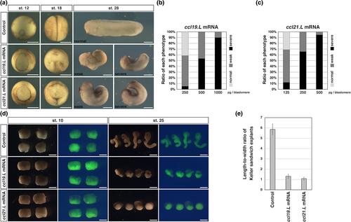 Figure 2. Phenotypes of dorsally ccl19.L and ccl21.L mRNA-injected embryos and Keller sandwich explants. (a) Phenotypes of embryos when injected with ccl19.L and ccl21.L mRNA into two dorsal blastomeres at the four-cell stage. The developmental stages are indicated in upper panels. Vegetal view (st. 12), dorsal view (st. 18), lateral view (st. 28). In the stage 28 images of mRNA-injected embryos, which had very short and bending anterior–posterior axes, the left panels show a representative example of the weak phenotypes with head structures, and the right panels show a representative example of the severe phenotype without head structures. Bars, 0.5 mm. (b and c) The appearance rates of phenotypes in Figure 2a. Normal phenotype (light gray), weak phenotype (dark gray), and severe phenotype (black) are shown. The quantity of injected mRNA is indicated at the bottom of the graph. (b) ccl19.L mRNA-injected embryos. Lane 1: n = 58; normal (41.4%), weak (53.4%), and severe (5.2%). Lane 2: n = 58; normal (0%), weak (46.6%), and severe (53.4%). Lane 3: n = 60; normal (0%), weak (10.0%), and severe (90.0%). (c) ccl21.L mRNA-injected embryos. Lane 1: n = 58; normal (31.0%), weak (56.9%), and severe (12.1%). Lane 2: n = 58; normal (0%), weak (34.5%), and severe (65.5%). Lane 3: n = 57; normal (0%), weak (12.1%), and severe (87.9%). (d) Keller sandwich explants of embryos injected dorsally with ccl19.L or ccl21.L mRNA. Upper panels indicate the stages of time-control embryos. Right images indicate fluorescent images of the explants. Overexpression of ccl19.L and ccl21.L mRNA inhibited the convergent extension cell movements. Bars, 0.5 mm. (e) Length-to-width ratio of Keller sandwich explants (st. 25). The length of the bending parts of the explants was measured along the axial elongation. The longest axis of each explant was divided by its widest perpendicular aspect except for the epidermal ectoderm region. Eight explants were measured in each category.