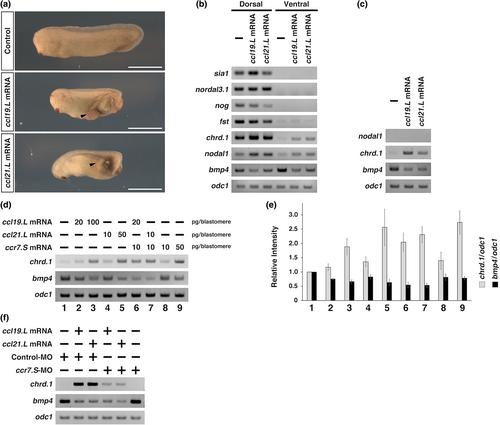 Figure 5. Effects of ccl19.L and ccl21.L on differentiation. (a) Phenotypes after injection of ccl19.L (1000 pg/blastomere) and ccl21.L (500 pg/blastomere) mRNA into two ventral blastomeres at the four-cell stage (st. 28). All injected embryos had ventral gastrulation defects and induced small secondary axis-like structures without head structures (n = 60, ccl19.L injection; n = 60, ccl21.L injection). Arrowheads indicate partial secondary axis-like structures. Bars, 1.0 mm. (b) RT-PCR analysis of the dorsal or ventral sectors of the ccl19.L and ccl21.L mRNA-injected embryos (st. 10). (c) RT-PCR analysis of the animal caps of the ccl19.L (500 pg/blastomere) and ccl21.L (250 pg/blastomere) mRNA-injected embryos (st. 9.5). (d) RT-PCR analysis of the animal caps after co-injection of ccl19.L and ccl21.L mRNA with ccr7.s mRNA (st. 9.5). The injected amounts are indicated. (e) The relative intensity of each gel electrophoresis band in Figure 5d. Signal intensity was measured by ImageJ, and the chrd.1/odc1 and bmp4/odc1 ratios were calculated. Values were normalized to the value for uninjected embryos (lane 1). (f) RT-PCR analysis of the animal caps after co-injection of ccl19.L (500 pg/blastomere) and ccl21.L (250 pg/blastomere) mRNA with Control-MO (20 ng/blastomere) or ccr7.s-MO (20 ng/blastomere) (st. 9.5).