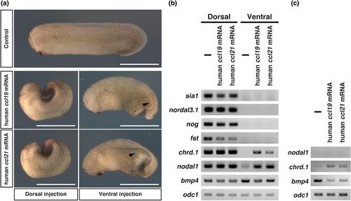 Figure 7. Effects of human ccl19 and ccl21 on early Xenopus development. (a) Phenotypes of embryos injected with human ccl19 and ccl21 mRNA (500 pg/blastomere) (st. 28). All dorsally injected embryos showed gastrulation defects (n = 43, human ccl19 injection, and n = 44, human ccl21.L injection). All ventrally injected embryos showed ventral gastrulation defects with small secondary axis-like structures (n = 44, human ccl19 injection, and n = 43, human ccl21.L injection). Arrowheads indicate small secondary axis-like structures. Bars, 1.0 mm. (b and c) RT-PCR analysis of the dorsal or ventral sectors (st. 10) (b) and the animal caps (st. 9.5) (c) of embryos injected with human ccl19 and ccl21 mRNA.
