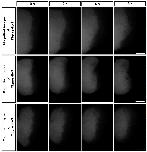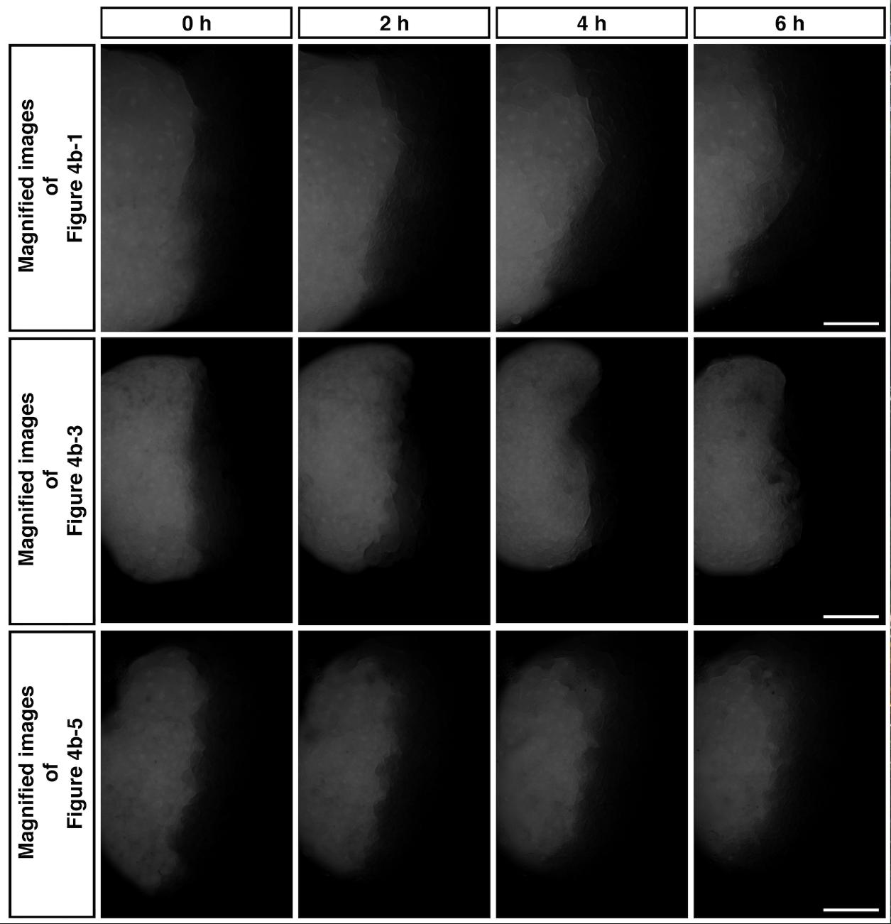 Highly magnified images of the red labeled ventral mesodermal sector of Figure 4b-1, b-3, b-5 are indicated in the top, center, and bottom panels, respectively. The elapsed time is indicated at the top. Bars, 0.5 mm.