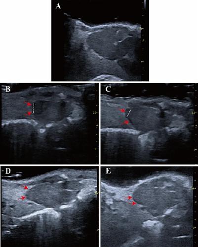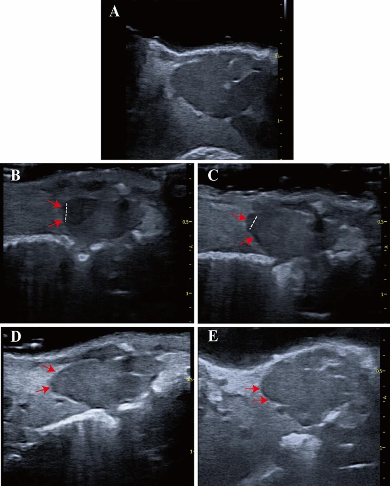 Fig. 3 Echocardiographic imaging can monitor regeneration of X. tropicalis injured hearts in a scar-free manner. A: Representative echocardiography image of the same-age nonapical resection group under B-mode. B: Representative image 5 days after apical resection. The damaged heart with a missing apex (left side of the dashed line) was clearly identified under echocardiography. C: Representative image 10 days after apical resection. D: Representative image 30 days after apical resection. E: Representative image 45 days after apical resection. The regeneration of the injured heart was able to be monitored and justified dynamically by the recovery of morphology and anatomic structure under echocardiographic imaging at 5 days, 10 days, 30 days and 45 days after apical resection. The boundary between the apical region of the regenerated heart and the surrounding tissue was clear, and no adhesion with the surrounding tissue was found at 30 days and 45 days after apical resection. Red arrow: Area of the boundary between the apical region of the regenerated heart and the surrounding tissue. Dashed line: Boundary of the regeneration zone and noninjury zone