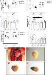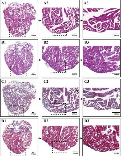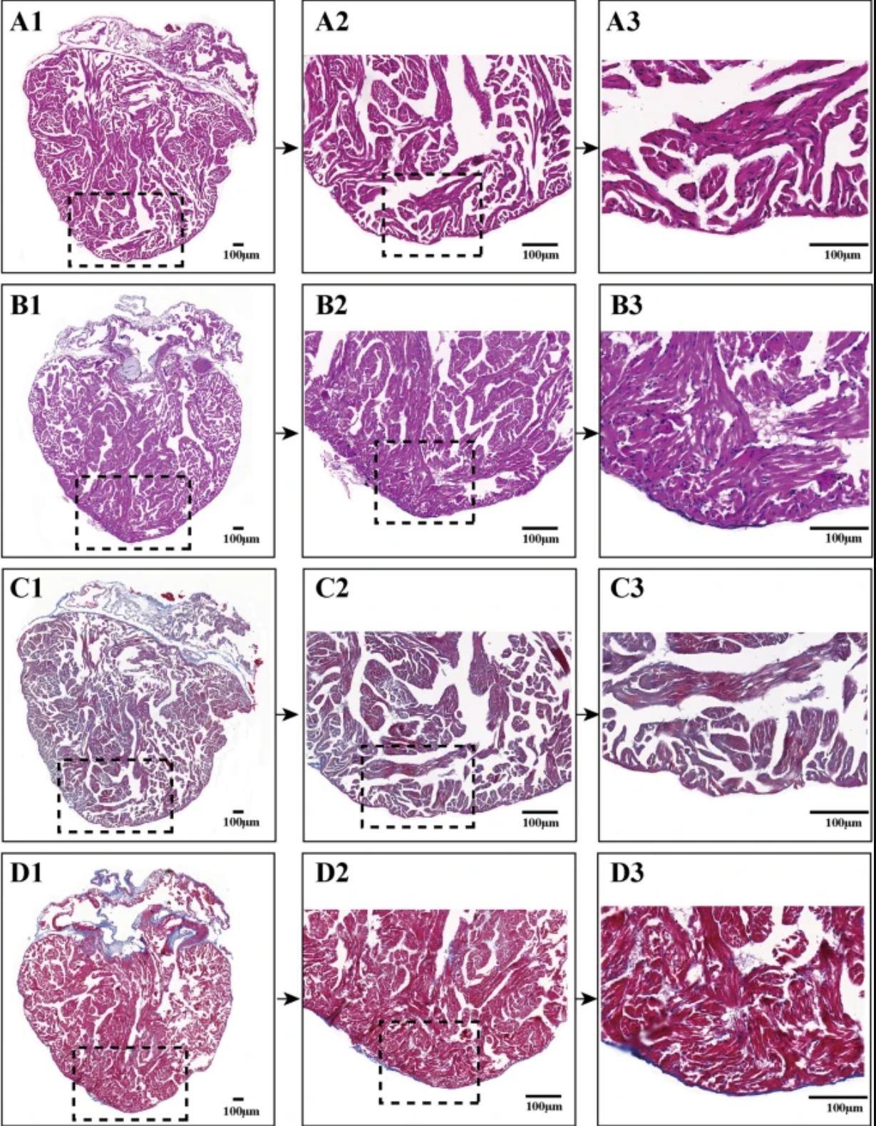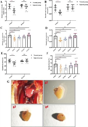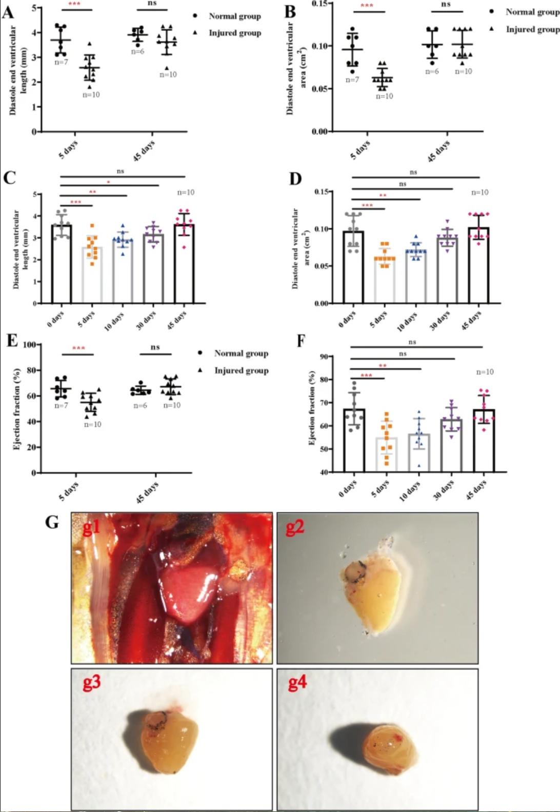 Fig. 4 Echocardiographic measurement and ex vivo gross observation confirm regeneration of the X. tropicalis injured heart in a scar-free manner. A and B: The diastole end ventricular length and the diastole end ventricular area of the injured heart group in the 5-daar group were significantly shorter than those of the same-age nonapical resection control group. The differences in the diastole end ventricular length and diastole end ventricular area of the injured heart group in the 45-daar group compared with the same-age nonapical resection control group were not statistically significant. C and D: The diastole end ventricular length and the diastole end ventricular area of the injured heart group were increased in the 10-daar, 30-daar and 45-daar hearts. At 30 daar, they were close to the same-age nonapical resection control group, while at 45 daar, the diastole end ventricular length and the diastole end ventricular area of the injured heart group were nearly the same compared with the same-age nonapical resection control group. E: The ejection fraction (EF) of the injured heart group at 5 daar was decreased significantly compared with the same-age nonapical resection control group. The difference in EF between the injured heart group and the same-age nonapical resection control group at 45 daar was not statistically significant. F: The EF of the injured heart was increased at 10 daar, 30 daar and 45 daar. At 30 daar, it was close to the same-age nonapical resection control group, while at 45 daar, the EF of the injured heart group was nearly the same compared with the same-age nonapical resection control group. G: Ex vivo gross observation of the regenerated X. tropicalis heart at 45 daar, in which echocardiography observation showed that the injured heart was regenerated with no adhesion and was scar-free. G-g1: Representative image of the regenerated X. tropicalis heart at 45 daar after in vivo exposure. G-g2: The front side image of the isolated regenerated heart of G-g1. G-g3: Image of the dorsal side of the isolated regenerated heart of G-g1. G-g4: Apical side image of the isolated regenerated heart of G-g1. Ex vivo gross observation confirmed that the cut apex was regenerated with nearly normal morphology, in which the boundary between the apical region of the regenerated heart and the surrounding tissue was clear, and no adhesion with the surrounding tissue was found. 5 daar: 5 days after apical resection