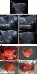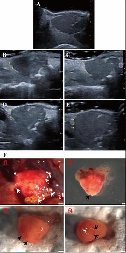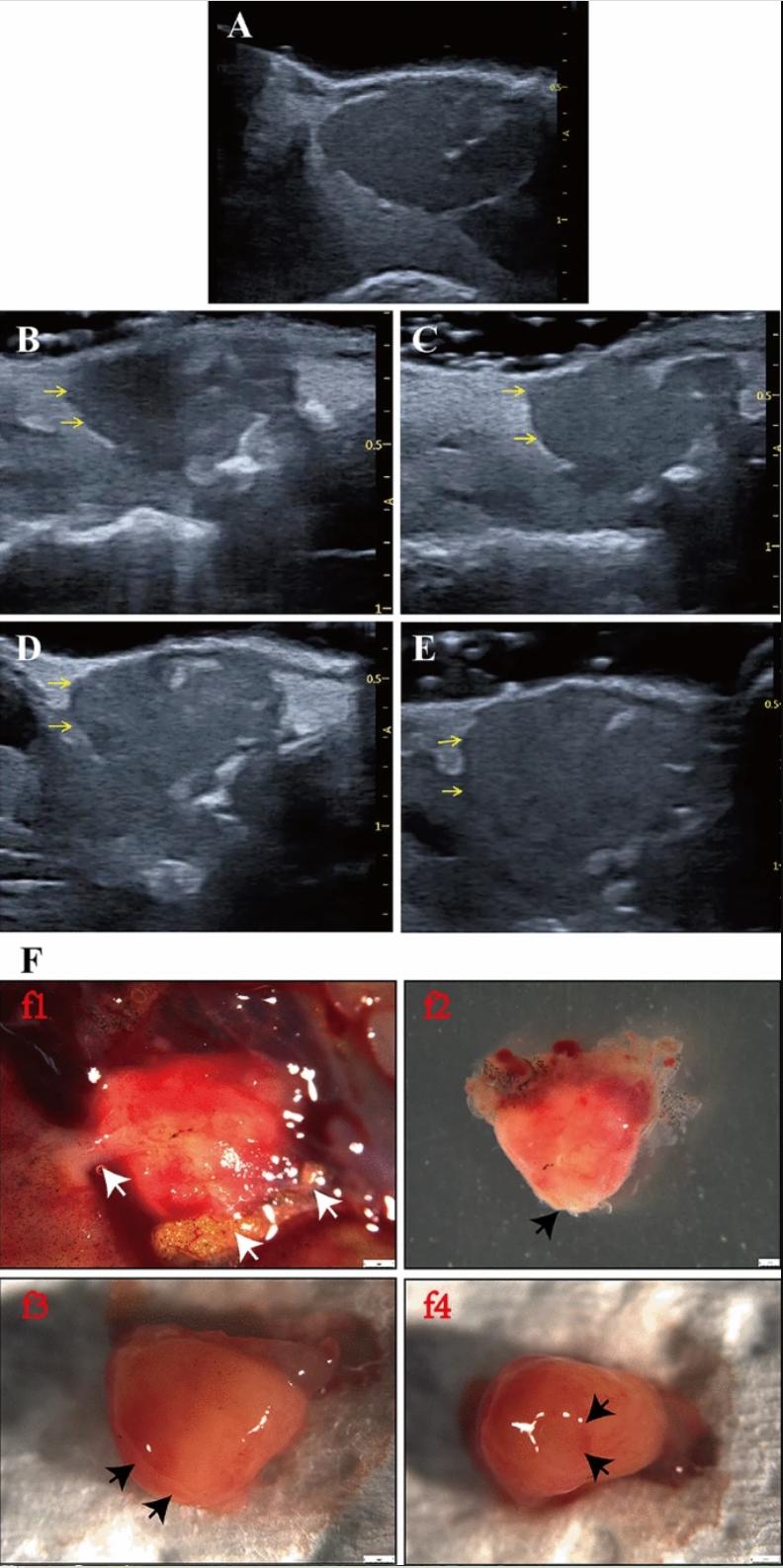 Fig. 5 Echocardiographic imaging can monitor nonperfect regeneration with the adhesion of X. tropicalis injured hearts. A: Representative echocardiography image of the same-age nonapical resection group under B-mode. B: Representative echocardiographic image of the injured heart at 5 daar, in which adhesion was identified at the boundary between the apical region of the regenerated heart and the surrounding tissue. C: Representative echocardiographic image of the injured heart at 10 daar, in which adhesion was identified at the boundary between the apical region of the regenerated heart and the surrounding tissue. D: Representative echocardiographic image of an injured heart at 30 daar, in which adhesion was identified at the boundary between the apical region of the regenerated heart and the surrounding tissue. E: Representative echocardiographic image of the injured heart at 45 daar, in which adhesion was identified at the boundary between the apical region of the regenerated heart and the surrounding tissue. Yellow arrow: The adhesion between the apical region of the regenerated heart and the surrounding tissue. F: Ex vivo gross observation of the regenerated X. tropicalis heart at 45 daar, in which echocardiography observation showed that the injured heart was regenerated with nonperfect regeneration with adhesion. F-f1: Representative image of the regenerated X. tropicalis heart at 45 daar after in vivo exposure. White arrow: Adhesion tissue. F-f2: Front side image of the isolated heart of F-f1. F-f3: Image of the dorsal side of the isolated heart of F-f1. F-f4: Apical side image of the isolated heart of F-f1. Black arrow: A defect after the adhesion tissue was cleaned during heart isolation. Ex vivo gross observation confirmed that the cut apex was regenerated in a nonperfect manner with adhesion, in which the boundary between the apical region of the regenerated heart and the surrounding tissue was connected to adhesion tissue. 5 daar: 5 days after apical resection