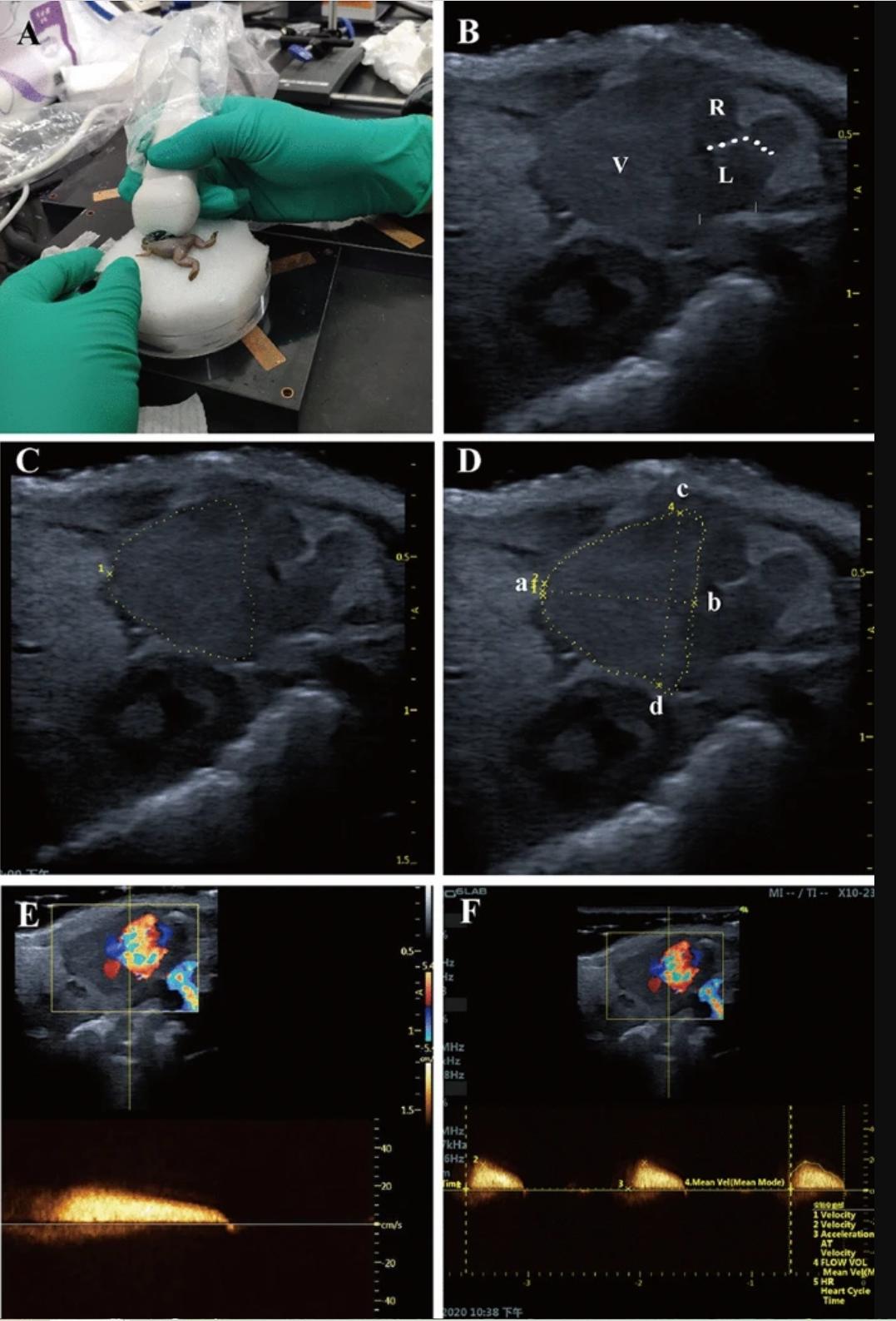 Fig. 1 The morphology and anatomy of the X. tropicalis heart can be observed clearly using small animal echocardiography A: The cardiac images are obtained from the parasternal long-axis of X. tropicalis using small animal echocardiography. B: Representative image of the subcostal 3-chamber view of the X. tropicalis heart under B-mode echocardiography. Ventricle (V). Right atrium (R). Left atrium (L). Atrial septum (dashed line). C: Diagram showing the diastole end ventricular girth (dashed line). D: Diagram showing the diastole end ventricular length (a to b) and diastole end ventricular width (c to d). E: Representative image of pulsed-wave Doppler of the ventricle for hemodynamic analysis. Assessed area (dotted rectangle). F: Measurement of peak blood flow velocity and blood flow acceleration of the ventricle. Assessed area (dotted rectangle)