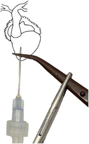 Figure 7. With the pericardium removed the 3 chambers of the heart and truncus arteriosus are easily visible. Use forceps to gently grasp the ventricle by its apex and then insert the needle through the forceps. Be careful not to cause unnecessary damage to the ventricle or other chambers as this will compromise the perfusion efficiency.