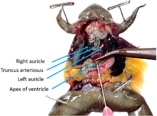 Figure 6. (left) Ventral diagram of X. laevis heart. (right) Heart diagram, with pericardium removed, showing the correct needle and clamp placement.