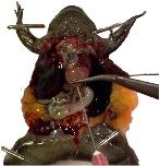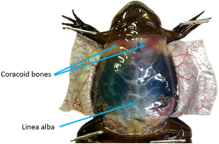 Figure 2. Mature female X. tropicalis pinned through each limb. Use toothed dissecting forceps to pull the skin near the cloaca taught to perforate it with dissection scissors and create 2 flaps as shown.