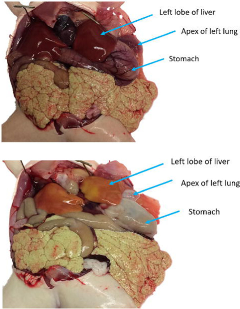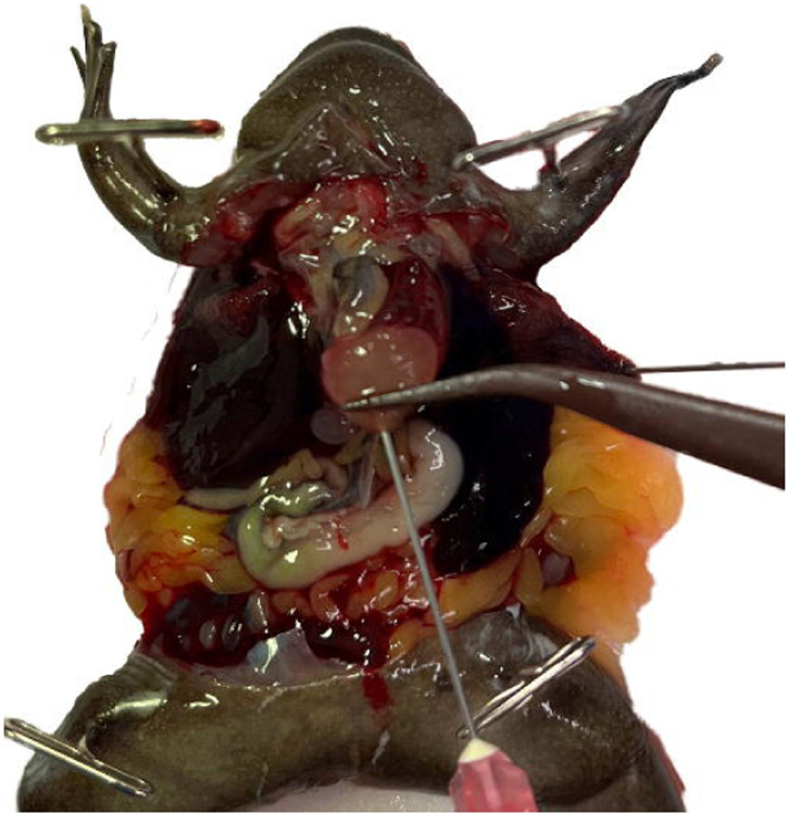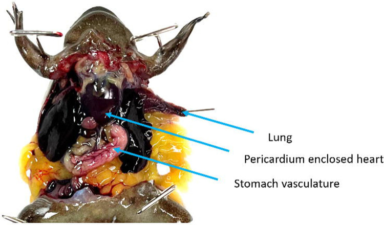 Figure 4. The coelomic cavity of a mature X. tropicalis male. The coracoid bones have been reduced providing access to the pericardium-enclosed heart. The stomach has been shifted in front of the left lobe of the liver and its vasculature is clearly visible. The left lung has been pulled out of the coelomic cavity by its tip and pinned to ensure that it does not retract during the rinsing process.
