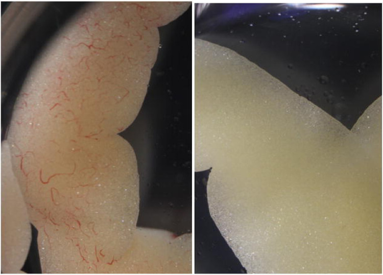 Figure 10. X. laevis fat body lobe sampled before (left) perfusion and a fat body lobe of the same individual, sampled after (right) perfusion.