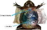 Figure 3. With the ventral skin open but the peritoneum intact the linea alba is visible. To reduce the likelihood of damaging the underlying tissues grasp the linea alba and pull it taught prior to cutting. The coracoid bones are visible through the peritoneum. Once the coelomic cavity has been opened these bones should be reduced to give better access to the heart.