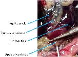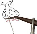 Figure 5. The pericardium is a thin tough membrane enclosing the heart. Using tissue forceps gently grasp the pericardium and then use the tip of iridectomy or iris scissors to perforate it. Once perforated, peel it up, away from the heart.