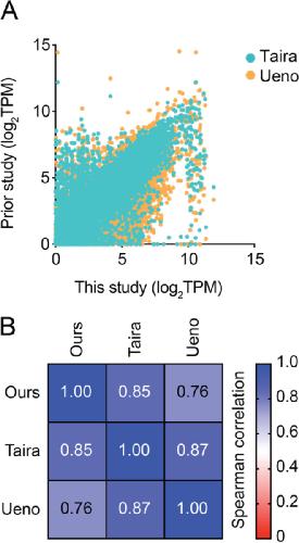 Figure 2. Comparison of our RNA-seq data with two other published datasets. a Plot showing transcripts per million (TPM) for matched transcripts between this study (X-axis) and two datasets in a previous study (Session et al., 2016). b Array representing the Spearman rank correlation between each dataset in (a).
