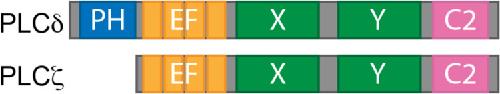 Figure 3. Domain architecture of PLC isoforms PLCδ and PLCζ. Schematic representation of the domain structures: pleckstin homology (PH) domain, EF hands, X and Y catalytic domains, and the C-terminal C2 domain.