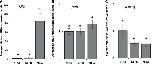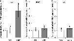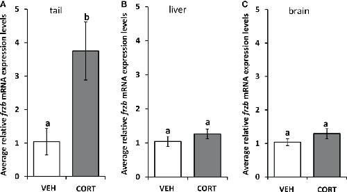Figure 3. Tissue expression profile of frzb in tadpoles. Premetamorphic tadpoles (NF 54) were treated with vehicle and 100 nM CORT (corticosterone) for 24 hours. Tails (A), livers (B), and brains (C) were dissected, followed by RNA extraction and quantitative PCR to measure mRNA expression of frzb and the housekeeping gene rpl8. Bars represent mean mRNA levels relative to rpl8 and normalized to a vehicle control sample. n = 10 tail samples per treatment. Error bars represent SE. Letters indicate significant groups, p < 0.05.