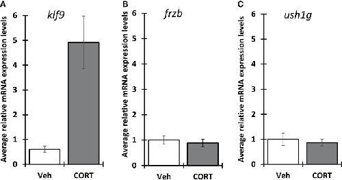 Figure 7. Induction of klf9, frzb and ush1g in X. laevis. Premetamorphic (NF 54) X. laevis tadpoles were treated with vehicle control or 100 nM CORT (corticosterone) for 24 hours followed by tail RNA extraction and quantitative PCR to quantify mRNA expression of klf9