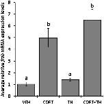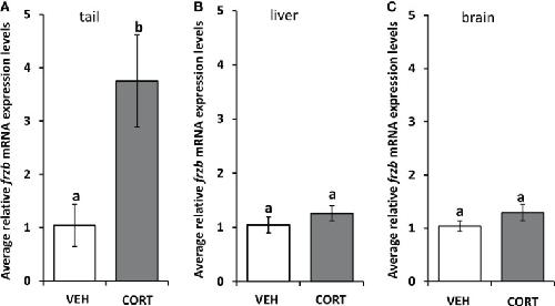 (C) and the housekeeping gene rpl8. Bars represent mean mRNA levels relative to rpl8 and normalized to a vehicle control sample. n = 10 tail samples per treatment. Error bars represent SE. Letters indicate significant groups, p < 0.05.