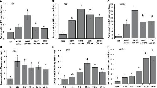 Figure 6. Dose response and time course for CORT induction of frzb, ush1g, and klf9 in tadpole tails. (A-C) Premetamorphic tadpoles (NF 54) were treated with vehicle and 50, 100, 250, and 500 nM of CORT (corticosterone) for 24 hours. (D-F) Premetamorphic tadpoles (NF 54) were treated with 100 nM CORT for 0, 3, 6, 12, 24, and 48 hours. Tails were dissected from tadpoles followed by RNA extraction and quantitative PCR to measure mRNA expression of frzb, ush1g, and klf9 and the housekeeping gene rpl8. Bars represent mean mRNA levels relative to rpl8 and normalized to a vehicle control sample. n = 10 tail samples per treatment. Error bars represent SE. Letters indicate significant groups, p < 0.05.