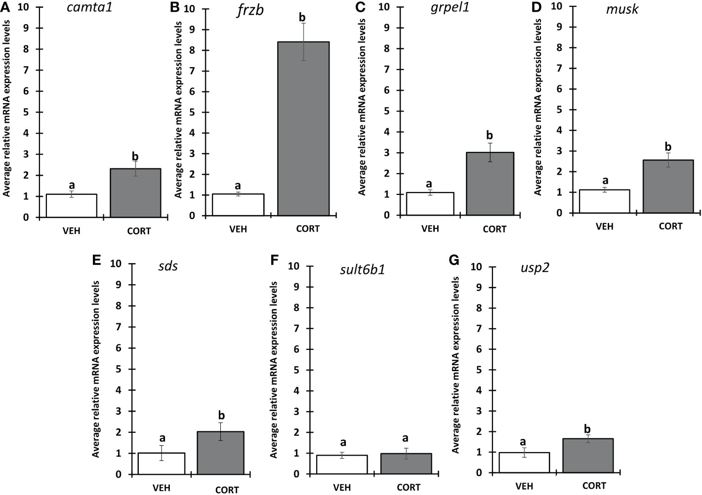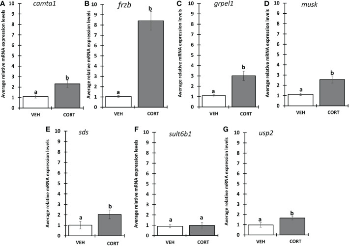 FIGURE 1 Evaluation of CORT response in selected genes. Premetamorphic tadpoles at Nieuwkoop and Faber stage 54 (NF54) were treated with vehicle control or 100 nM CORT (corticosterone) for 24 hours followed by tail RNA extraction and quantitative PCR to quantify mRNA expression using gene specific primers for (A) calmodulin binding transcription activator 1 (camta1), (B) frizzled related protein (frzb), (C) GrpE like 1, mitochondrial (grpel1) (D) muscle associated receptor tyrosine kinase (musk), (E) serine dehydratase (sds), (F) sulfotransferase family 6B member 1 (sult6b1), and (G) ubiquitin specific peptidase 2 (usp2). Bars represent mean mRNA levels relative to the housekeeping gene rpl8 and normalized to a vehicle control sample. n = 10 tail samples per treatment. Error bars represent SE. Letters indicate significant groups, p < 0.05.