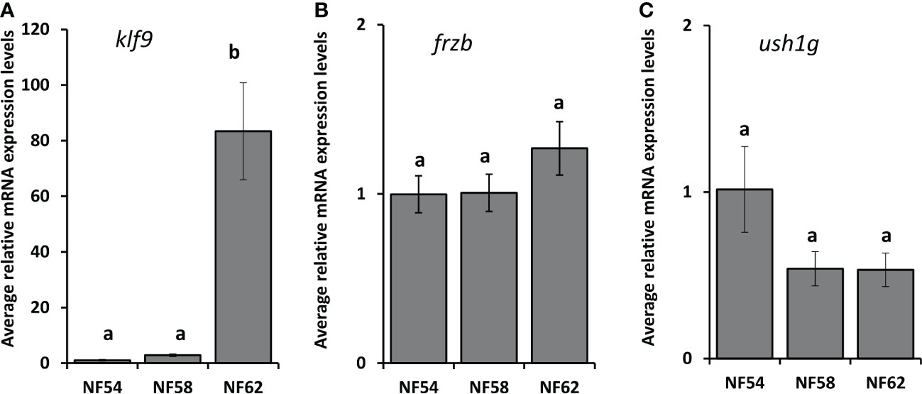 FIGURE 4 Developmental expression profile of klf9, frzb, and ush1g in tadpole tails throughout metamorphosis. Tails from tadpoles at the indicated NF stages were harvested, followed by tail RNA extraction and quantitative PCR to measure mRNA expression levels of klf9 (A), frzb (B), ush1g (C) and the housekeeping gene rpl8. Bars represent mean mRNA levels relative to rpl8 and normalized to a vehicle control sample. n = 10 tail samples per treatment. Error bars represent SE. Letters indicate significant groups, p < 0.05.