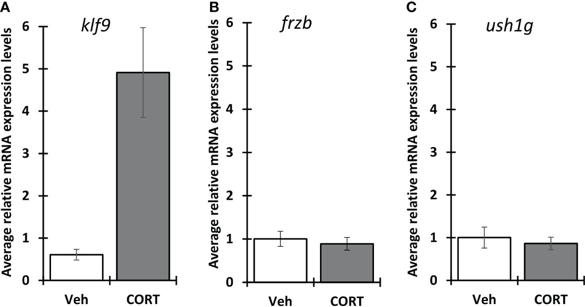FIGURE 7 Induction of klf9, frzb and ush1g in X. laevis. Premetamorphic (NF 54) X. laevis tadpoles were treated with vehicle control or 100 nM CORT (corticosterone) for 24 hours followed by tail RNA extraction and quantitative PCR to quantify mRNA expression of klf9 (A) , frzb (B), and ush1g (C). Bars represent mean mRNA levels relative to the housekeeping gene rpl8 and normalized to a vehicle control sample. n = 10 tail samples per treatment. Error bars represent SE. Letters indicate significant groups, p < 0.05.