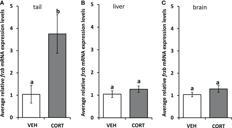 FIGURE 3 Tissue expression profile of frzb in tadpoles. Premetamorphic tadpoles (NF 54) were treated with vehicle and 100 nM CORT (corticosterone) for 24 hours. Tails (A), livers (B), and brains (C) were dissected, followed by RNA extraction and quantitative PCR to measure mRNA expression of frzb and the housekeeping gene rpl8. Bars represent mean mRNA levels relative to rpl8 and normalized to a vehicle control sample. n = 10 tail samples per treatment. Error bars represent SE. Letters indicate significant groups, p < 0.05.