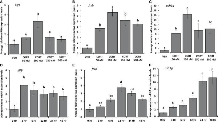 FIGURE 6 Dose response and time course for CORT induction of frzb, ush1g, and klf9 in tadpole tails. (A-C) Premetamorphic tadpoles (NF 54) were treated with vehicle and 50, 100, 250, and 500 nM of CORT (corticosterone) for 24 hours. (D-F) Premetamorphic tadpoles (NF 54) were treated with 100 nM CORT for 0, 3, 6, 12, 24, and 48 hours. Tails were dissected from tadpoles followed by RNA extraction and quantitative PCR to measure mRNA expression of frzb, ush1g, and klf9 and the housekeeping gene rpl8. Bars represent mean mRNA levels relative to rpl8 and normalized to a vehicle control sample. n = 10 tail samples per treatment. Error bars represent SE. Letters indicate significant groups, p < 0.05.