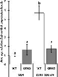Figure 5. Impaired frzb induction in glucocorticoid receptor knockout (GRKO) tails. Premetamorphic wild-type and GRKO tadpoles (NF 54) were treated with vehicle control or 100 nM CORT (corticosterone) for 24 hours followed by tail RNA extraction and quantitative PCR to quantify mRNA expression of frzb and the housekeeping gene rpl8. Bars represent mean mRNA levels relative to rpl8 and normalized to a vehicle control sample. n = 10 tail samples per treatment. Error bars represent SE. Letters indicate significant groups, p < 0.05.