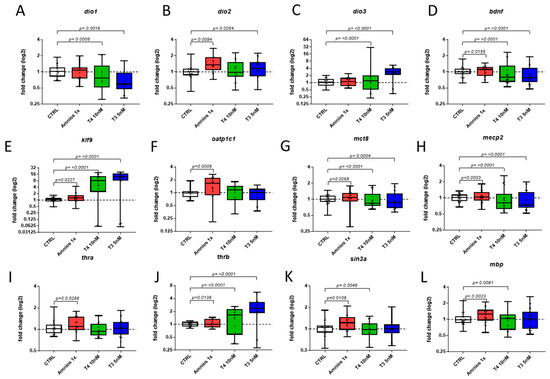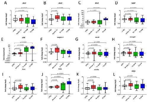 Figure 2. Gene expression after embryonic exposure to the amniotic mixture and THs. Embryos (NF 1–NF 47) were exposed to DMSO (CTRL), amniotic mixture at 1x concentration (Amnios 1X), T4 (10 nanomolar), and T3 (5 nanomolar). After brain dissection at stage NF 47, RNA extraction and RT-qPCR were conducted on genes involved in the TH signaling pathway, (A) dio1, (B) dio2, (C) dio3, (E) klf9, (F) oatp1c1, (G) mct8, (I) thra, (J) thrb, and brain development, (D) bdnf, (H) mecp2, (K) sin3a, and (L) mbp. Results are normalized to the geometric mean of the expression levels of the genes ube2m and ralb. Results are a pool of 6 independent replicates with n = 5 by group by replicate. The line in each box represents the median.