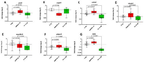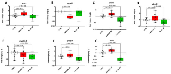 Figure 5. Gene expression after embryonic exposure to the amniotic mixture and THs. Embryos (NF 1–NF 47) were exposed to DMSO (CTRL), amniotic mixture at 1x concentration (Amnios 1X), and T4 (10 nanomolar). After brain dissection at stage NF 47, RNA extraction and RT-qPCR were conducted on genes involved in TH signaling or autism-related genes, (A) arnt2, (B) cep41, (C) cntn4, (D) ctnnb1, (E) myo9b, (F) plppr4, (G) tshb. 2.1. Exposure to TH but Not Amniotic Mixture Induces Both Apoptosis and Proliferation.