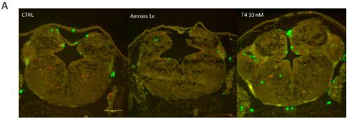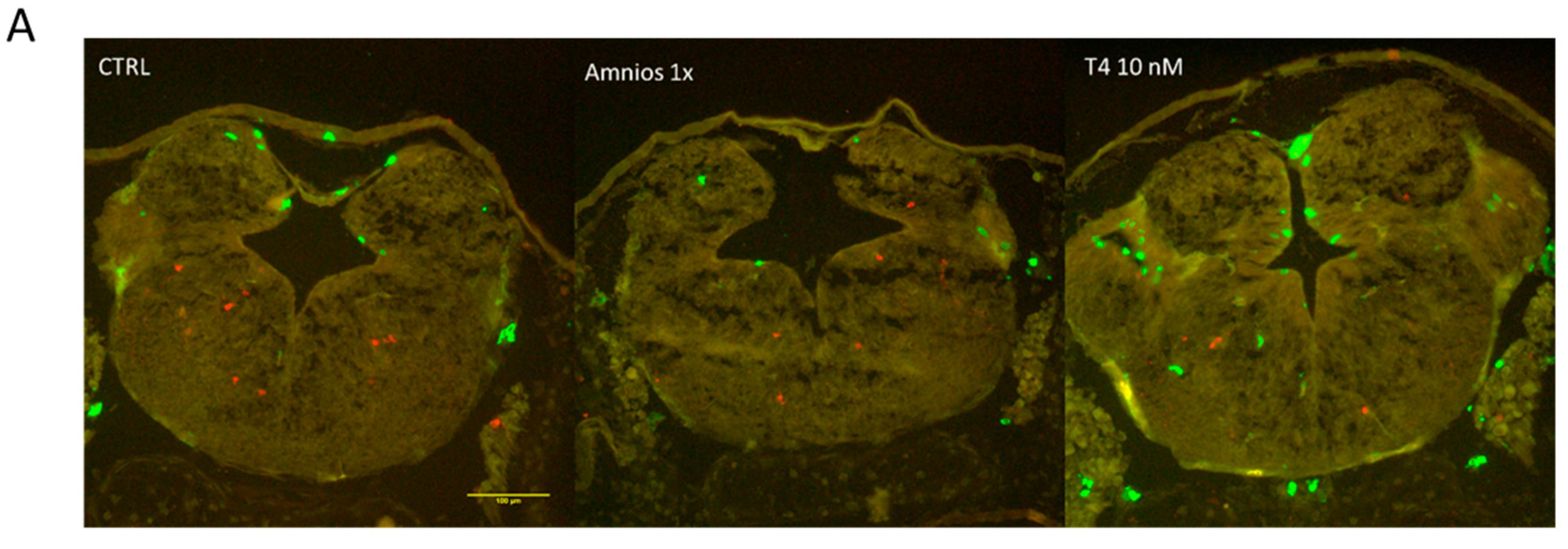 Figure 6. Effect of Amnios 1X and T4 on proliferation and apoptosis in tadpole brains. For each treatment group, 2 tadpoles from 3 different females were analyzed. (A) Example cross-sectional images of brains following immunochemistry: apoptosis marker in red (caspase3), proliferation marker in green (PH3). Scale bar, 100 µm. (B) Average number of positive cell nuclei per section for caspase3 and PH3, and the ratio of proliferative/apoptotic cells.