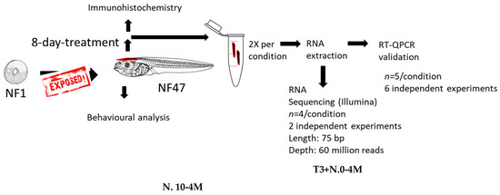 Figure 1. Schematic representation of the conducted exposure study. Fifteen X. laevis tadpoles per group were exposed for 8 days starting just after fertilization (NF 1) to stage NF 47 before gene expression analysis, mobility assays, and brain immunohistochemistry.