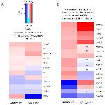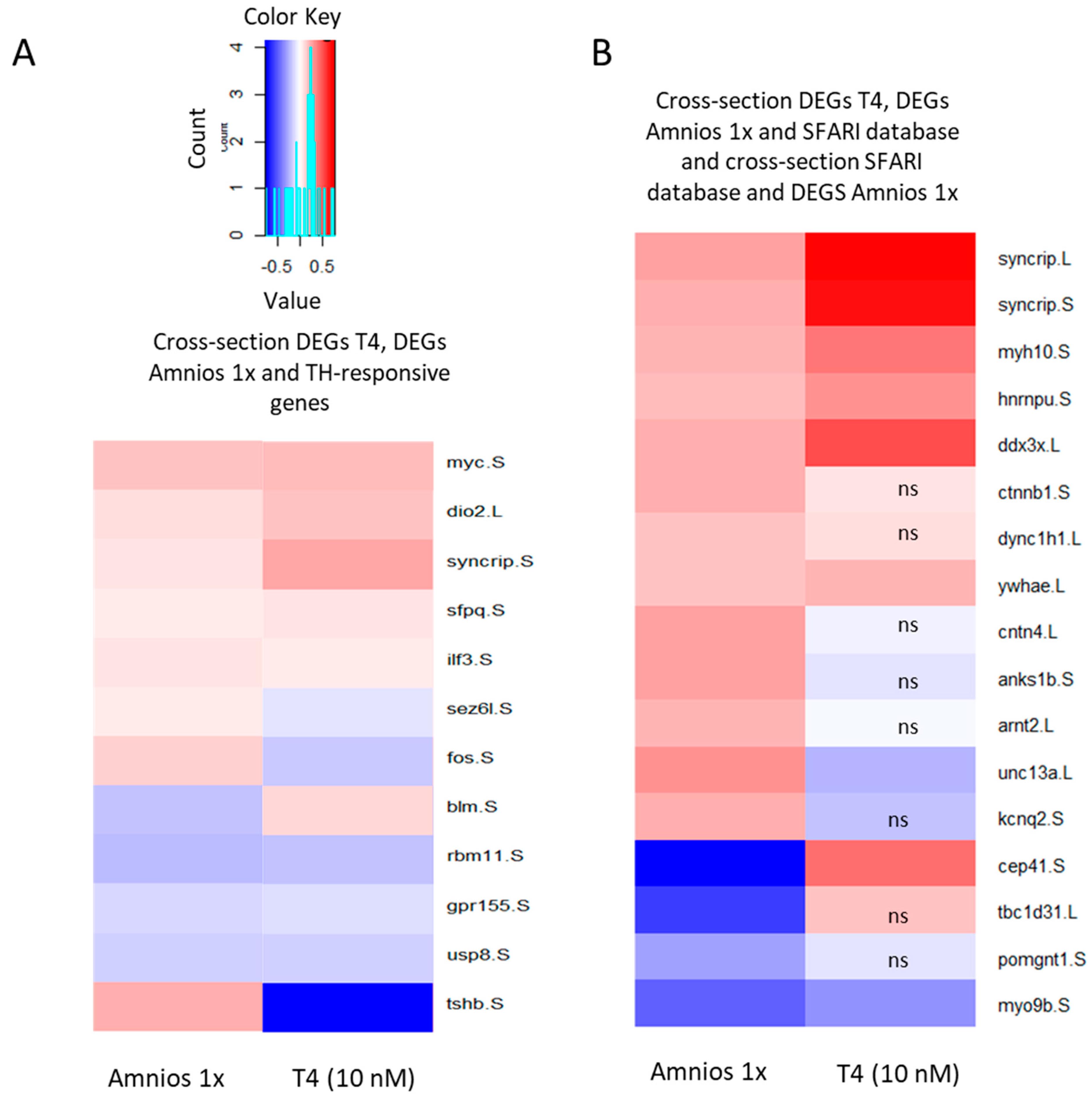 Figure 4. Changes in expression levels of genes specifically affected by amniotic mixture or T4 treatment. Heatmap depicts the average change in the expression level of genes affected by either amniotic mixture (Amnios 1X) or T4 (10 nM). Gene names are shown at the right of the heatmap. The color bar represents log2 differences from the control for each treatment. (A) DEGs that are in common between T4 and amniotic treatment as well as TH-responsive genes [22]. (B) DEGs that are common between either amniotic mixture and SFARI gene list and DEGs in common between Amnios 1X, T4 (10 nM), and SFARI gene list. The letters ns stand for non-significant; these genes do not belong to the DEG list.