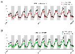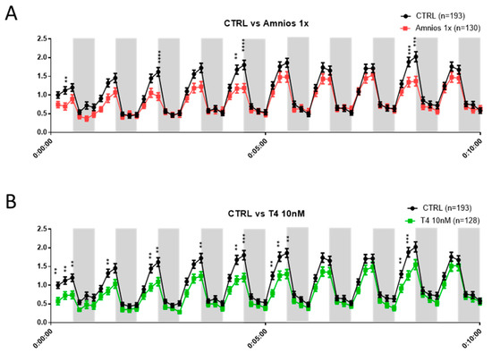 Figure 7. Behavioral study of tadpoles exposed to amniotic mixture and T4 (10 nM). The normalized distance was measured during 10 min trials with 30 s light/30 s dark alternation using Video tracking Noldus Ethovision system. NF 47 tadpoles, directly after 8-day exposure to either (A) the amniotic mixture or (B) T4 (10 nM), were used to investigate traveled distance. Graph: mean +/− SEM, multiple t-tests with FDR approach, FDR (Q) = 5%, ** p < 0.01, *** p < 0.001, and **** p < 0.0001. For each exposure, 3 technical replicates were conducted. These replicates were pooled, and each replicate contains between 37 and 48 tadpoles per condition. The total amount of tadpoles used can be found within the figure legend.