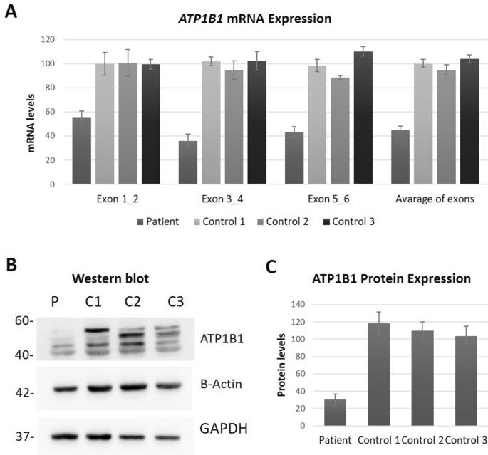 mRNA and protein expression analysis of ATP1B1. A mRNA expression analysis of ATP1B1 cDNA in the patient peripheral blood cells compared to healthy controls (Patient: 44.71 ± 3.63%, Control 1: 100.04 ± 3.40%, Control 2: 94.63 ± 4.31%, Control 3: 103.99 ± 3.21%. P = 0.00001). Four independent qPCRs were performed and samples were analysed as triplicates in each run. B Western blot analysis results of ATP1B1 expression normalized against β-ACTIN and GAPDH. C) ATP1B1 protein expression quantification in patient versus healthy control LCLs (Patient: 30.22 ± 6.43%, Control 1: 118.20 ± 13.21%, Control 2: 110.05 ± 10.23%, Control 3: 103.64 ± 11.04%. P = 0.0002). WB was replicated four times for quantification. Statistical analysis was performed by one-way ANOVA. P < 0.05 considered statistically significant