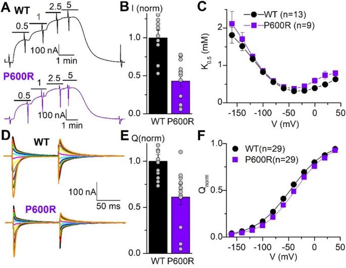 Electrophysiological findings. A Representative traces from an oocyte expressing WT (that is the RD ouabain resistant version) and P600R pumps. Oocytes were held at − 50 mV and exposed to the indicated [K+] (in mM) to activate pump current. Vertical deflections indicate application of 100 ms-long pulses to measure voltage-dependent parameters. B K0.5 for K+ activation of pump current obtained from Hill fits (“Methods”) to the [K+] dependencies at each voltage, as a function of the applied voltage. C Current, normalized to the mean from oocytes expressing WT pumps on the same day under the same conditions (results from 3 batches of oocytes, 11 WT and 13 P600R oocytes total. D Ouabain-sensitive transient currents elicited by pulses from − 50 mV to voltages ranging from − 140 mV to + 40 mV (in 20 mV increments). E Charge (integral of current transients) as a function of voltage normalized to the total charge moved in the whole voltage range (Qtot = 21.6 ± 10.6 for WT and 15.3 ± 11.1 for P600R). Line plots are Boltzmann distributions fitted to the data (mean V0.5 = − 47.5 ± 4.3 mV for WT and − 38.1 ± 4.3 mV for P600R, n = 29 each). F Mean total charge (measured from Boltzmann distributions in individual experiments) normalized to the mean from oocytes expressing WT pumps on the same day