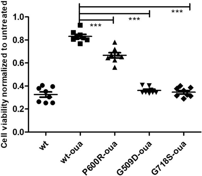 Ouabain survival (luciferase) assay. Viability of ouabain insensitive HEK cells transfected with wild type ATP1A1, p.P600R and, positive controls p.G509D and p.G718S normalized to untreated cells transfected with the same plasmid