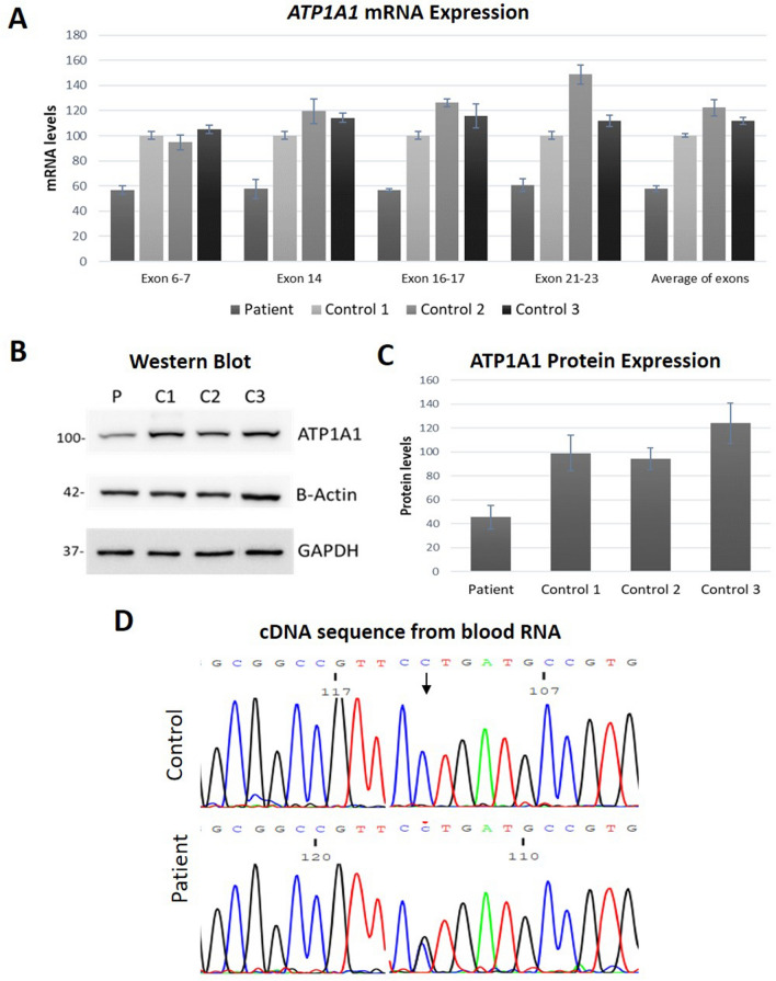 Figure 2. mRNA and protein expression analysis of the wild type and mutant ATP1A1. A mRNA expression of ATP1A1 exons in the patient peripheral blood cells compared to healthy controls (Patient: 58.04 ± 2.16%, Control 1: 100.25 ± 2.32%, Control 2: 122.32 ± 6.54%, Control 3: 111.76 ± 2.77%. P = 0.00002). Three independent qPCRs were performed and samples were run as triplicates in each experiment. B Western blot analysis results of ATP1A1 expression normalized against β-ACTIN and GAPDH. C Quantification of protein expression of ATP1A1 in the patient versus healthy control LCLs (Patient: 45.49 ± 10.02%, Control 1: 99.01 ± 14.84%, Control 2: 94.15 ± 9.10%, Control 3: 123.94 ± 17.00%. P = 0.002). WB was replicated eight times for quantification. Statistical analysis was performed by one-way ANOVA. P < 0.05 considered statistically significant. D The expression of mutant ATP1A1 (c.1799 C > G, P600R) transcript in patient blood confirmed by Sanger sequencing
