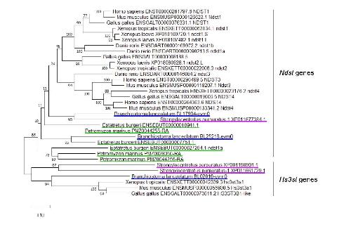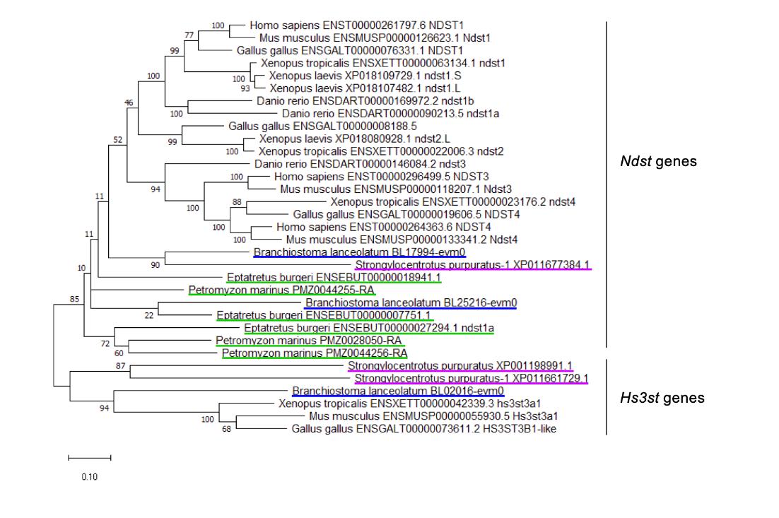 Figure S3. Phylogenetic tree of ndst genes. The tree was constructed with coding sequences of ndst genes using the maximum likelihood method. As the outgroup, we used coding sequences of hs3st genes of Mus musculus, Gallus gallus, and X. tropicalis because these genes showed the lowest E values other than ndst genes. Each branch is labeled with the species name, gene ID, and gene name, in that order. However, if the gene was not annotated, the gene name is not shown in the figure. Green lines indicate genes of cyclostomes. Blue lines indicate cephalochordates. Magenta lines indicate echinoderms.