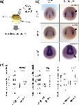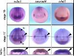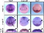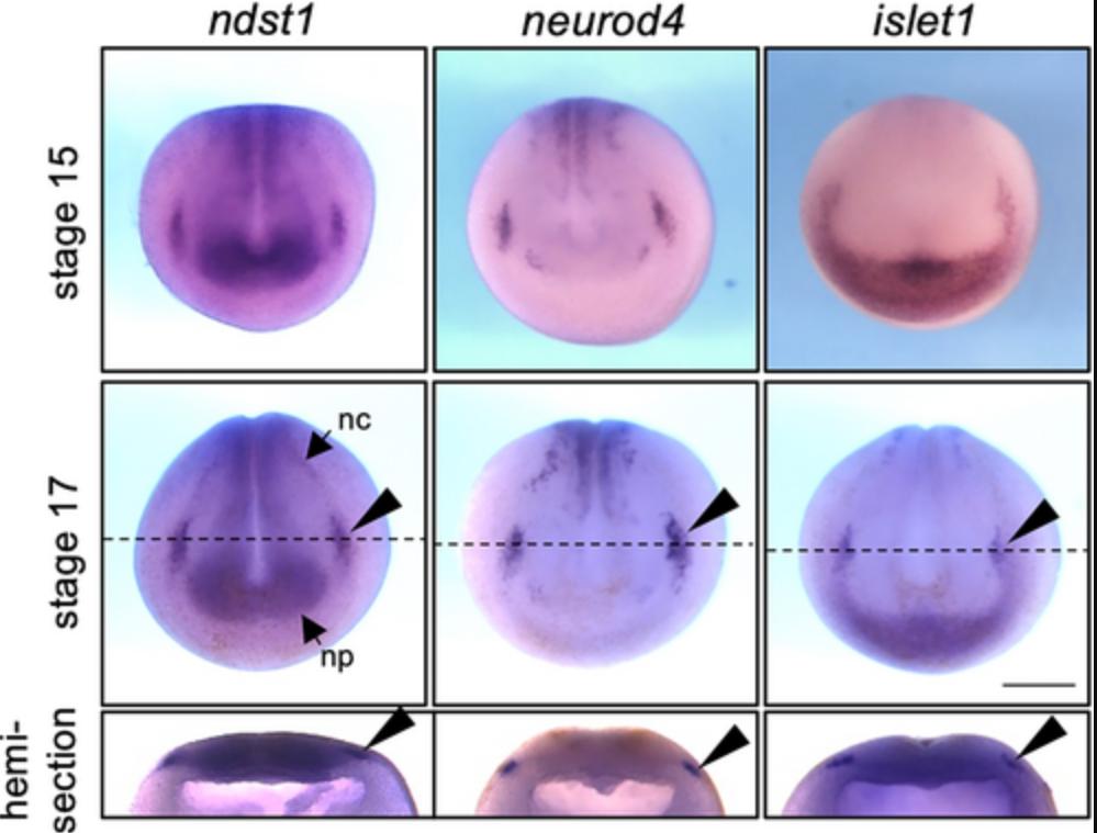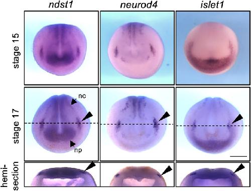 Figure 1. Expression pattern of ndst1, neurod4, and islet1 in Xenopus neurula. Spatial expression pattern of ndst1, neurod4, and islet1 was visualized by in situ hybridization at the neurula stage (stages 15, 17; anterior view, dorsal to the top). The specimen was cut with a razor at the dashed line (hemi-section). All three genes were expressed at the lateral sensorial layer of neuroectoderm (arrowhead). Scale bar = 500 μm. nc, neural crest; np, neural plate.