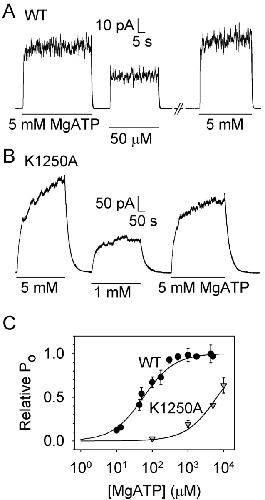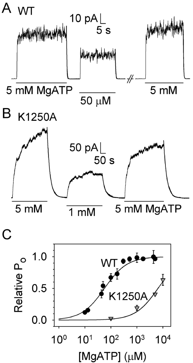 Figure 3. . The K1250A mutation strongly shifts the [MgATP] dependence of Po to higher [MgATP]. (A) steady state level of macroscopic current of prephosphorylated WT CFTR channels was ∼2-fold lower at 50 μM MgATP than during bracketing exposures to 5 mM MgATP (as expected from Fig. 2); lines below traces mark MgATP applications. Rapid current decay on MgATP washout gave (exponential fit lines superimposed on traces) τ = 0.45 s, τ = 0.40 s, τ = 0.38 s, from left to right (mean τ = 0.54 ± 0.04 s, n = 21, pooled from all [MgATP]). (B) Macroscopic current of K1250A channels was reduced ≥2-fold on lowering [MgATP] from 5 to 1 mM. Superimposed exponential fit lines show slower current decay (note 10-fold contracted time scale relative to A) with, from left to right, τ = 28 s, τ = 30 s, τ = 32 s (mean τ = 39 ± 5, n = 9, from all [MgATP]). (C) Semilog plot of Po versus [MgATP]. Steady currents (averaged over final ≥20 s) at each [MgATP], normalized to the mean bracketing level at 5 mM MgATP, yielded least-squares. Michaelis fit parameters for WT: Po max = 1.04 ± 0.01, K0.5 = 57 ± 2 μM; for K1250A: Po max = 2.45 ± 0.88, K0.5 = 6.5 ± 4.8 mM; for display, WT (circles) and K1250A (inverted triangles) data (mean ± SD, 3 ≤ n ≤9) were renormalized to these Po max values. Because 10 mM, the highest [MgATP] used, was still far from saturating for K1250A channels, the fit for this mutant is less accurate, evident from large errors on fit parameters.