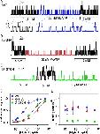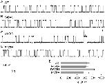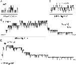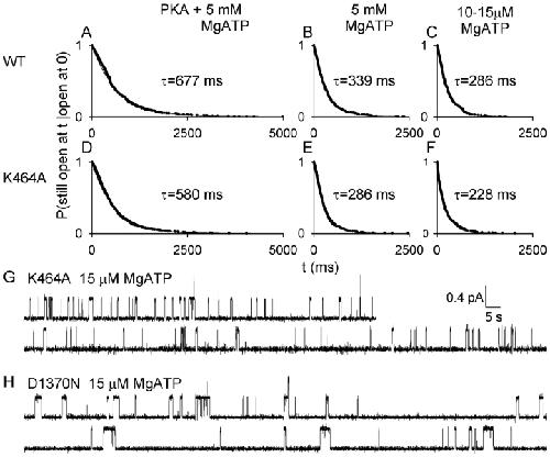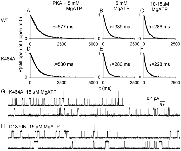 Figure 4. . Burst duration distributions are similar for WT (A–C) and K464A (D–F) channels under comparable conditions, as indicated (PKA present for left column only). Fitted curves (through data points) show single exponentials from maximum-likelihood fits. Improvement of the fit by inclusion of a second exponential component was judged using the algorithm described in Csanády et al. (2000). Only for K464A at μM MgATP (F) could the likelihood be significantly increased by including a second component, though with a shorter (but not longer; Ikuma and Welsh, 2000) mean: τ1 = 30 ms, a1 = 0.17; τ2 = 263 ms, a2 = 0.83; increase in log likelihood, ΔLL = 8.3; number of bursts fitted, M = 263; giving (ΔLL − ln(2M) = 2.0). The small differences between means at mM and μM MgATP (B vs. C, E vs. F) may be only apparent, as the mean τb, estimated by multichannel kinetic fits, from these same stretches of record at μM MgATP is not significantly different from that during intervening stretches in 5 mM MgATP (for WT: τbμM/τb5mM = 1.03 ± 0.07, n = 9; for K464A: τbμM/τb5mM = 0.95 ± 0.13, n = 7). (G and H) Representative traces showing gating of K464A and D1370N channels at 15 μM MgATP (after PKA removal). Prolonged bursts of K464A channels (Ikuma and Welsh, 2000) are not evident. Though variability among the four patches containing sufficiently few D1370N channels precluded pooling the data for burst distribution analysis, in none of those patches (analyzed separately) did introduction of a second component significantly improve the maximum likelihood fit.