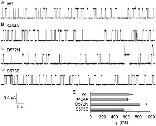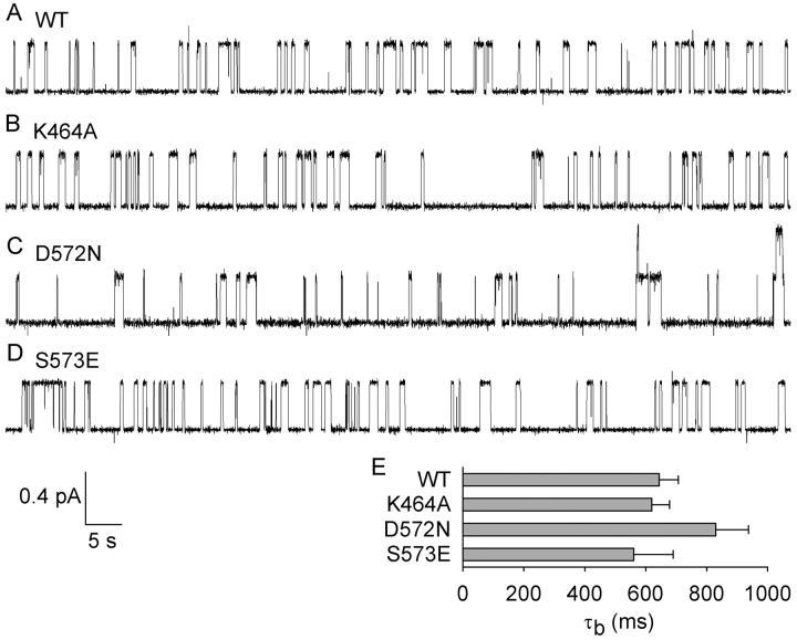 Figure 5. . Mutations at the NBD1 catalytic site do not markedly alter open burst duration of channels exposed to 5 mM MgATP and 300 nM PKA. Patches contained one WT (A), K464A (B), or S573E (D) channel, or more than one D572N (C) channel. (E) Summary of mean (±SEM) τb values at 5 mM MgATP and 300 nM PKA (n = 30, 21, 9, and 7 for WT, K464A, D572N, and S573E, respectively).