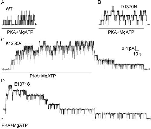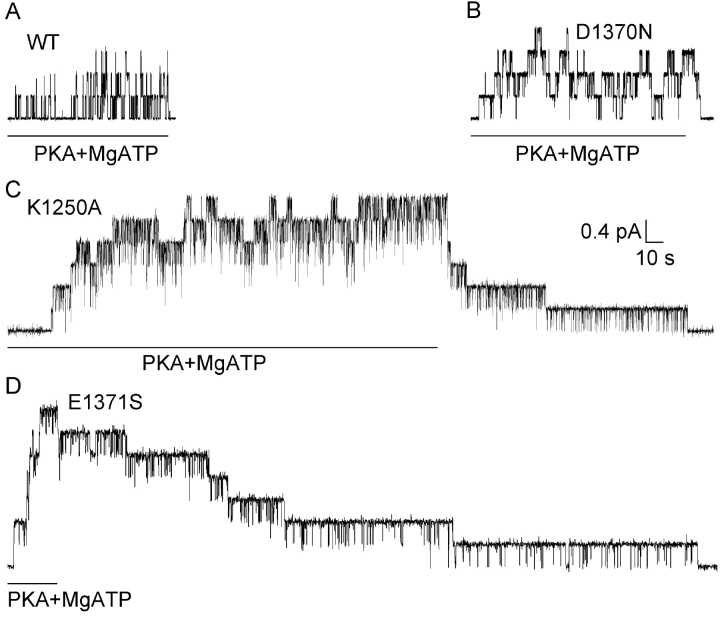Figure 6. . Mutations at the NBD2 catalytic site slow channel exit from open bursts. WT (A), D1370N (B), K1250A (C), and E1371S (D) CFTR channels were activated by 5 mM MgATP plus PKA as indicated: burst termination (∼0.4-pA downward steps) after nucleotide washout was slowed for NBD2 mutants, relative to WT. Note persistence of brief (intraburst) closures during K1250A and E1371S bursts, long after nucleotide withdrawal.