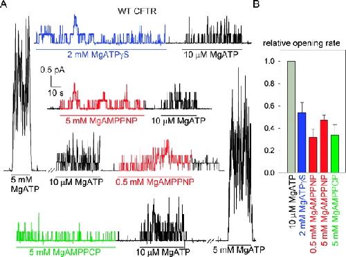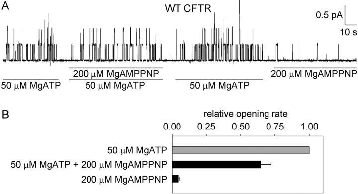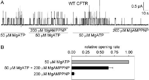 Figure 8. . MgAMPPNP inhibits MgATP-induced opening of WT channels. (A) Representative record of prephosphorylated channels, exposed alternately to 50 μM MgATP or to 50 μM MgATP plus 200 μM MgAMPPNP, and then to 200 μM MgAMPPNP alone. (B) Summary of rCO values (mean ± SEM, n = 3) normalized to the average of that obtained from the stretches in 50 μM MgATP.