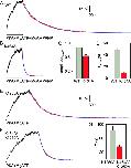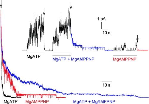 Figure 9. . Exit from MgAMPPNP-locked burst states is slower when bursts are initiated in the presence of MgATP. Patches with hundreds of prephosphorylated WT CFTR channels were repeatedly subjected to ∼30-s long exposures to nucleotides (as in inset), in varied sequence. Each trace in the main figure is the sum of 21 recordings, synchronized upon nucleotide washout (arrow; also in inset), from 12 patches, each exposed to 0.5 mM MgATP, 5 mM MgAMPPNP, or 0.5 mM MgATP + 5 mM MgAMPPNP alternately, an equal number of times. Exponential decay fit parameters are: after MgATP, a = 33 pA, τ = 0.8 s; after AMPPNP, single a = 8 pA, τ = 6.8 s; double af = 6 pA, as = 6 pA, τf = 0.7s, τs = 8.8 s; after MgATP + MgAMPPNP, af = 20 pA, as = 18 pA τf = 2 s, τs = 36.6 s. As solution exchange time was 0.5–1s, fast components do not accurately reflect channel closing.