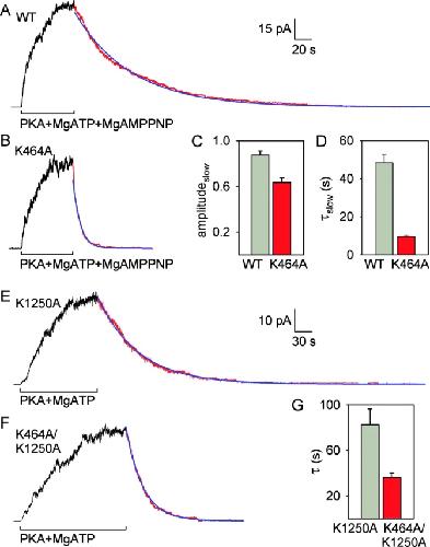 Figure 10. . The K464A mutation speeds exit from locked open burst states. (A) Macroscopic WT channel current activated by a mixture of 0.5 mM MgATP and 5 mM MgAMPPNP (+PKA) decays slowly upon removal of nucleotides. (B) Current decay is much faster for the K464A mutant in the same conditions. Blue fit lines in A and B show only the slow components of double exponential fits, with τs = 67.8s, as = 0.92 for WT, and τs = 8.7s, as = 0.79 for K464A. (C and D) Summaries of fractional amplitude, as (C), and time constant, τs (D), of the slow component from 18 WT and 16 K464A experiments. In controls with no MgAMPPNP, closure after exposure to MgATP and PKA yielded τ = 1.9 ± 0.2 s (n = 35) for WT and τ = 1.0 ± 0.1 s (n = 34) for K464A, and both constructs sometimes showed a small amplitude slower component: for WT, τs = 7.6 ± 1.7 s, as = 0.1 ± 0.03 (in 13/35 patches); for K464A, τs = 5.9 ± 0.8 s, as = 0.24 ± 0.04 (20/24 patches). (E) Macroscopic K1250A currents, activated by 5 mM MgATP + PKA, decay slowly on nucleotide withdrawal. (F) The additional K464A mutation accelerates channel closure from bursts: for the traces shown, τ = 71.7s (K1250A) and τ = 29.7s (K464A/K1250A). (G) Mean time constants of all 9 K1250A and 9 K464A/K1250A relaxations, each well fit by a single exponential.